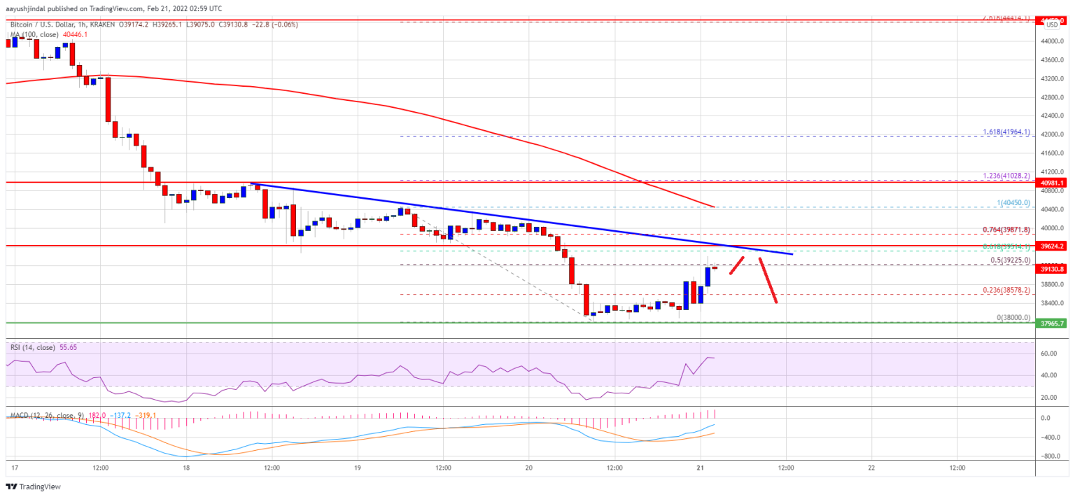 شتاب نزولی قیمت با شکستهشدن حمایت ۴۰٬۰۰۰ دلاری ومیانگین متحرک ساده (SMA) ۱۰۰ ساعته بیش از پیش تشدید شد. در ادامه حمایت ۳۹٬۵۰۰ دلار هم از دست رفت و قیمت در پایینترین سطح به ۳۸٬۰۰۰ دلار رسید. در حال حاضر اما قیمت تا حدودی سقوط روز گذشته را جبران کرده و بیت کوین بالای ۳۸٬۸۰۰ دلار قرار گرفته است.